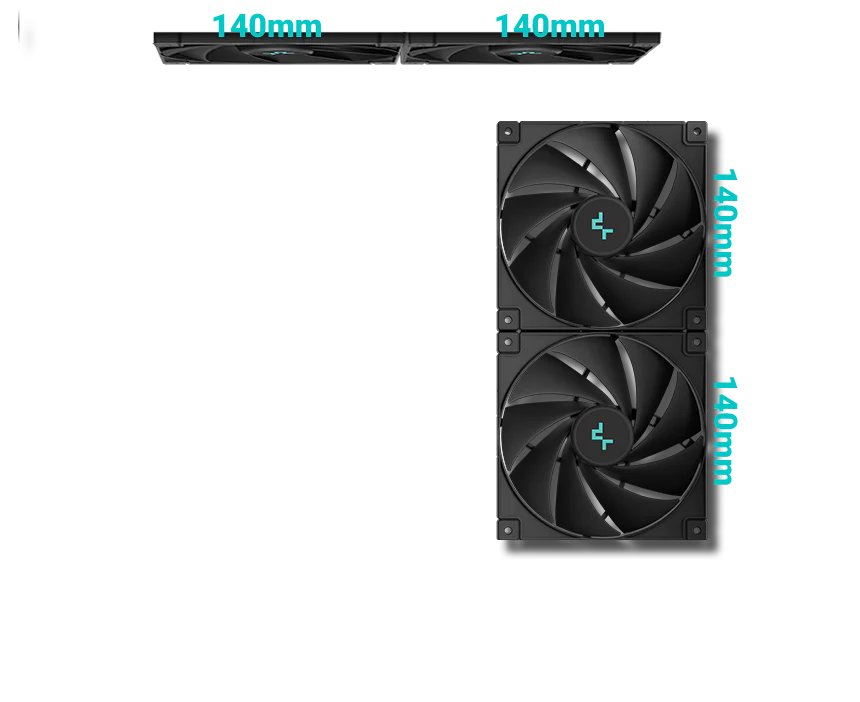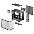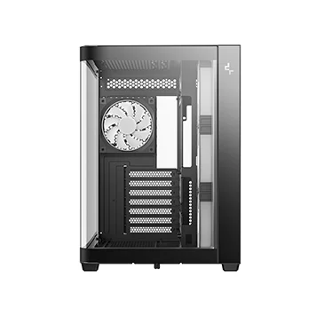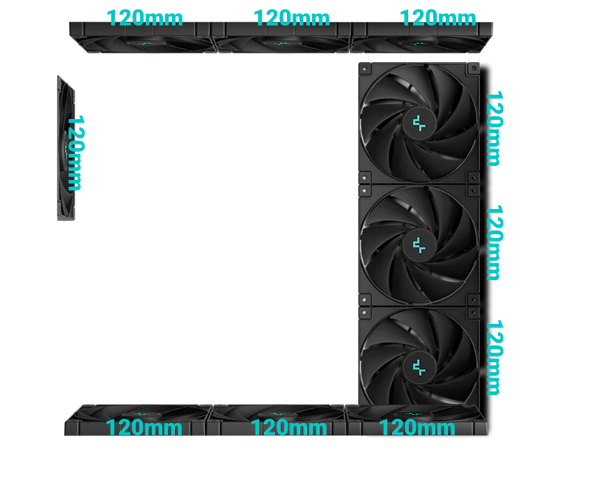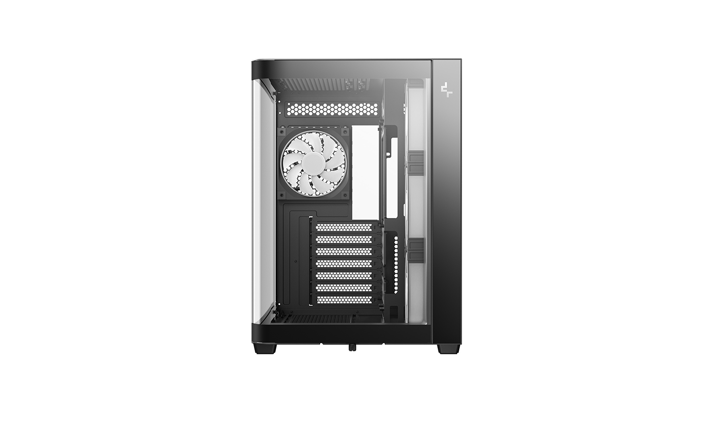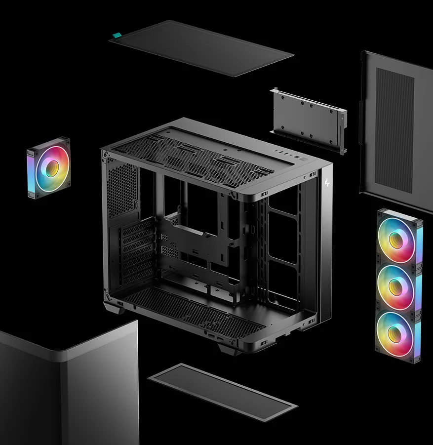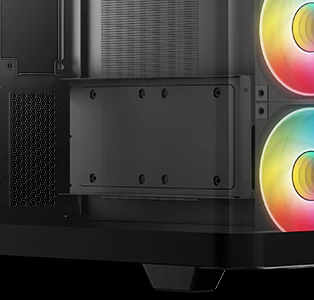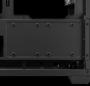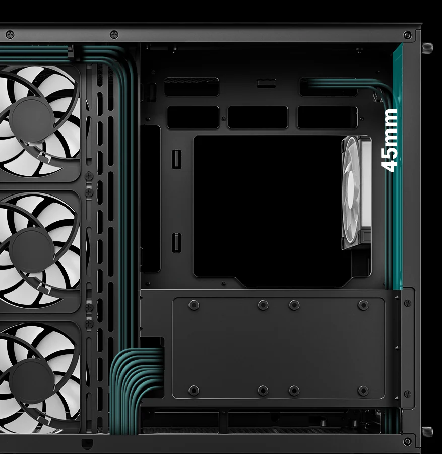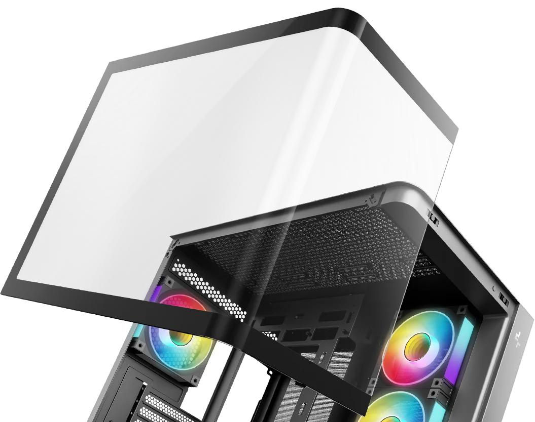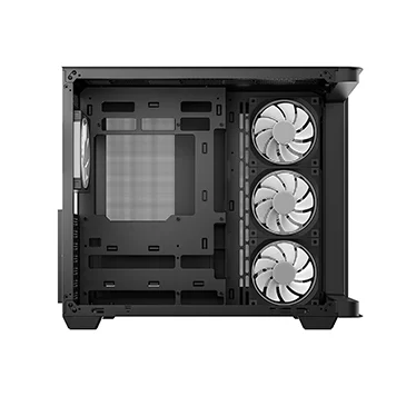 Корпус поставляется с четырьмя вентиляторами ARGB: три вентилятора с обратными лопастями установлены на боковой панели и один стандартный вентилятор — на задней панели. Конфигурация со сбалансированным вводом и выводом воздуха обеспечивает интенсивный воздушный поток и эффективное охлаждение без дополнительной настройки.