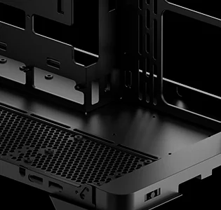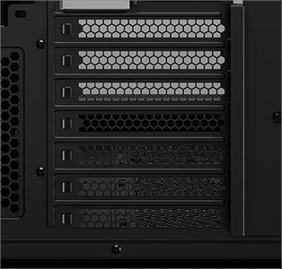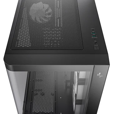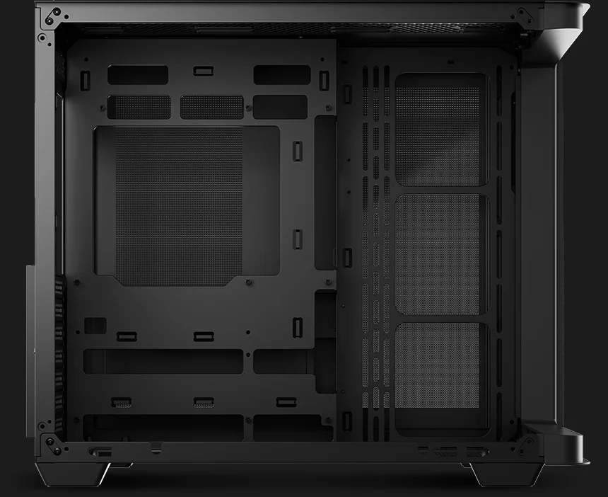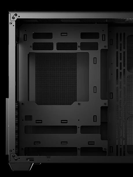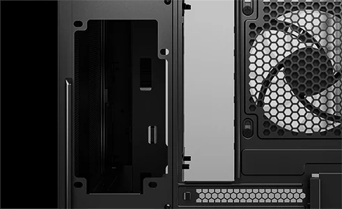 Компоновка с двумя камерами изолирует блок питания и накопители от основного воздушного потока. Большие сетчатые панели улучшают вентиляцию, входные реверсивные вентиляторы на боковой панели забирают свежий воздух, а задний вентилятор выводит тепло, за счет чего в корпусе образуется горизонтальный воздушный поток.