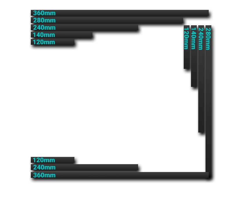 Сверху: 120/140/240/280/360 мм