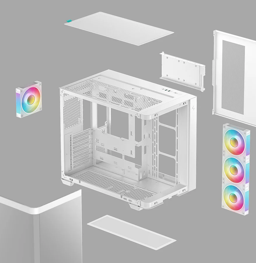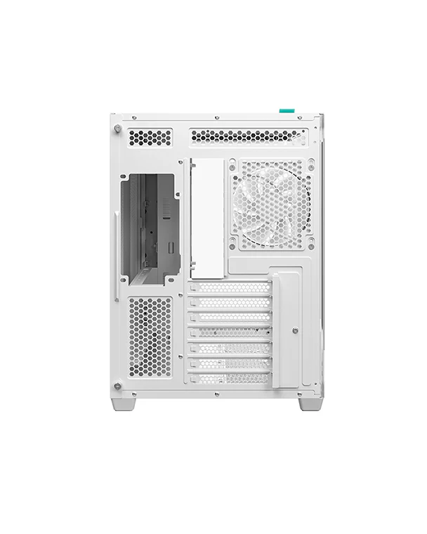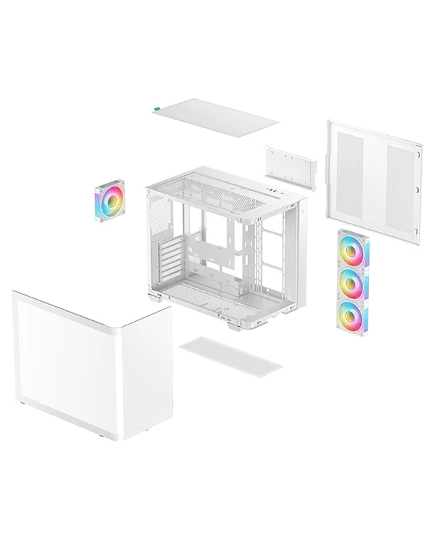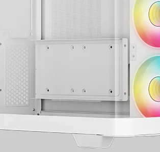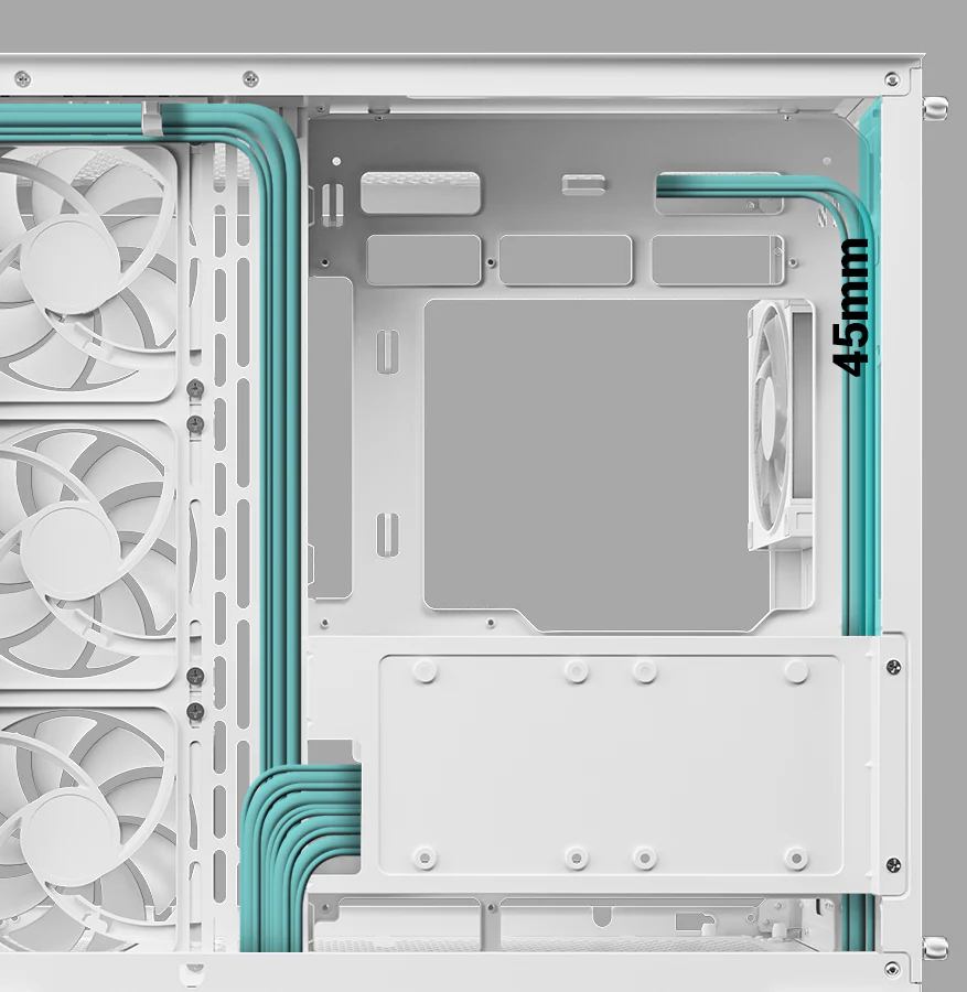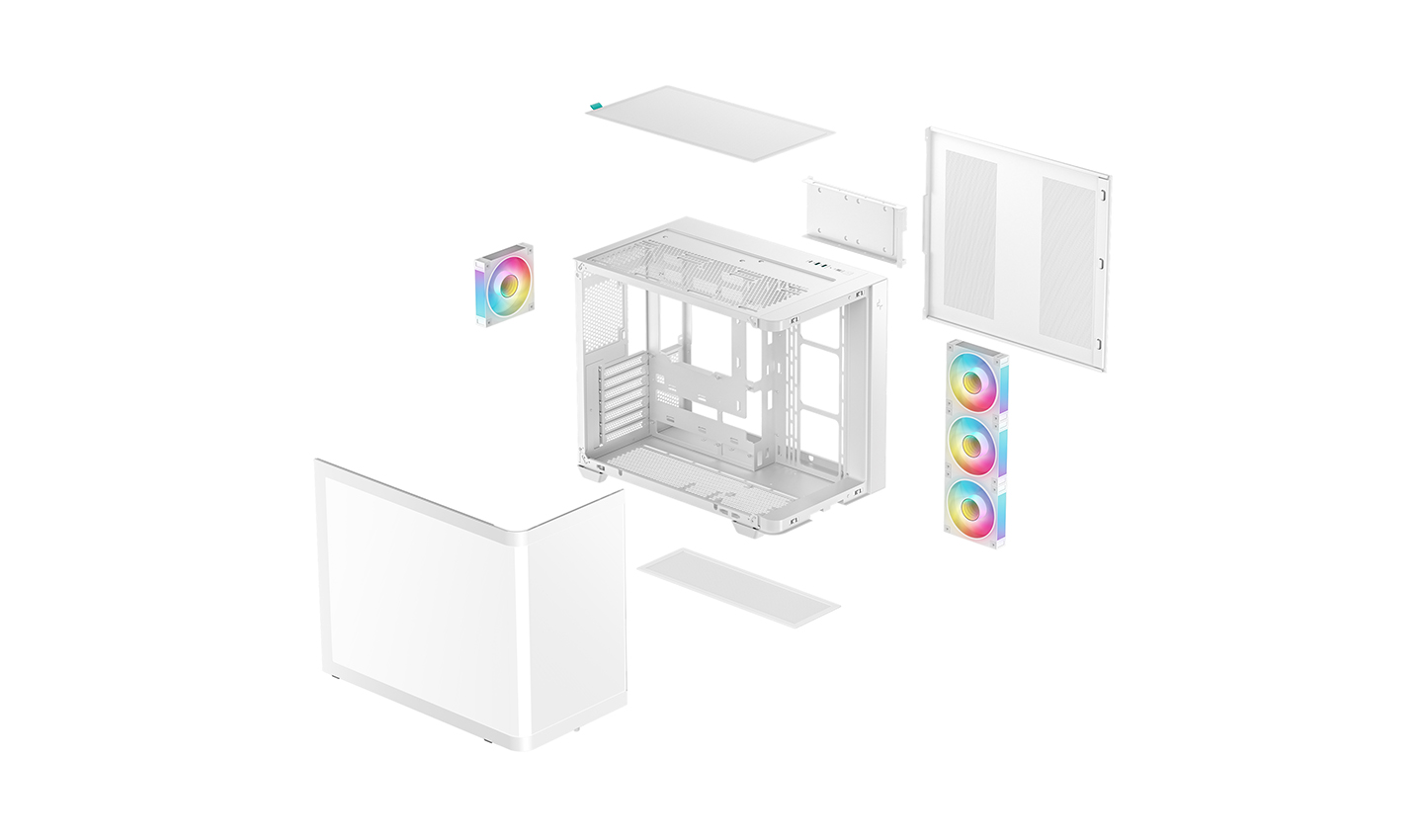 Корпус поставляется с четырьмя вентиляторами ARGB: три вентилятора с обратными лопастями установлены на боковой панели и один стандартный вентилятор — на задней панели. Конфигурация со сбалансированным вводом и выводом воздуха обеспечивает интенсивный воздушный поток и эффективное охлаждение без дополнительной настройки.