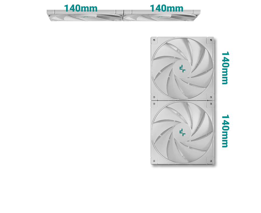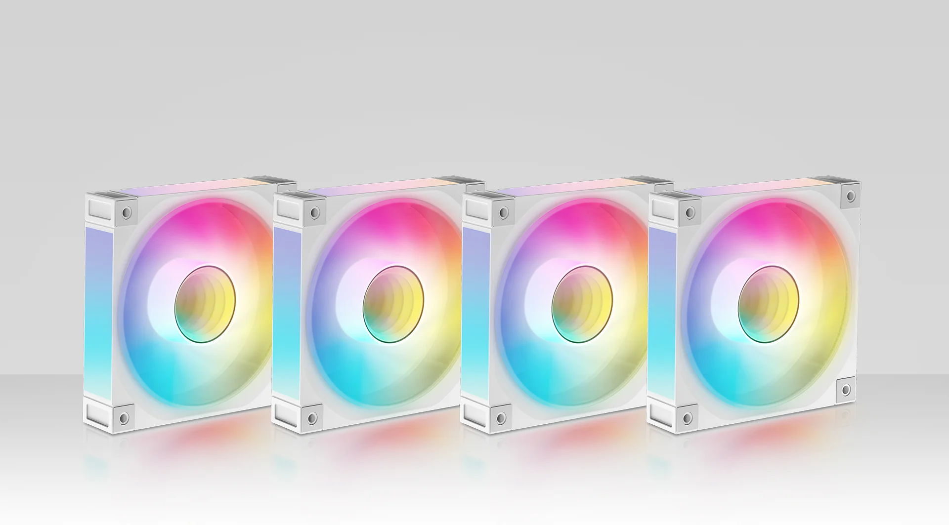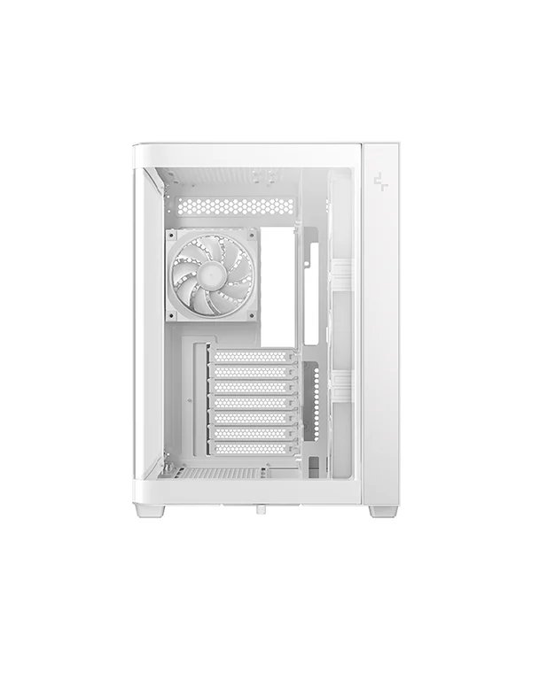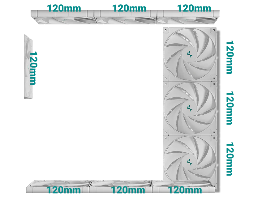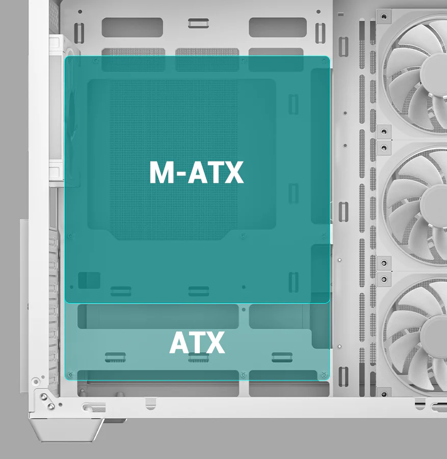 Корпус поставляется с четырьмя вентиляторами ARGB: три вентилятора с обратными лопастями установлены на боковой панели и один стандартный вентилятор — на задней панели. Конфигурация со сбалансированным вводом и выводом воздуха обеспечивает интенсивный воздушный поток и эффективное охлаждение без дополнительной настройки.