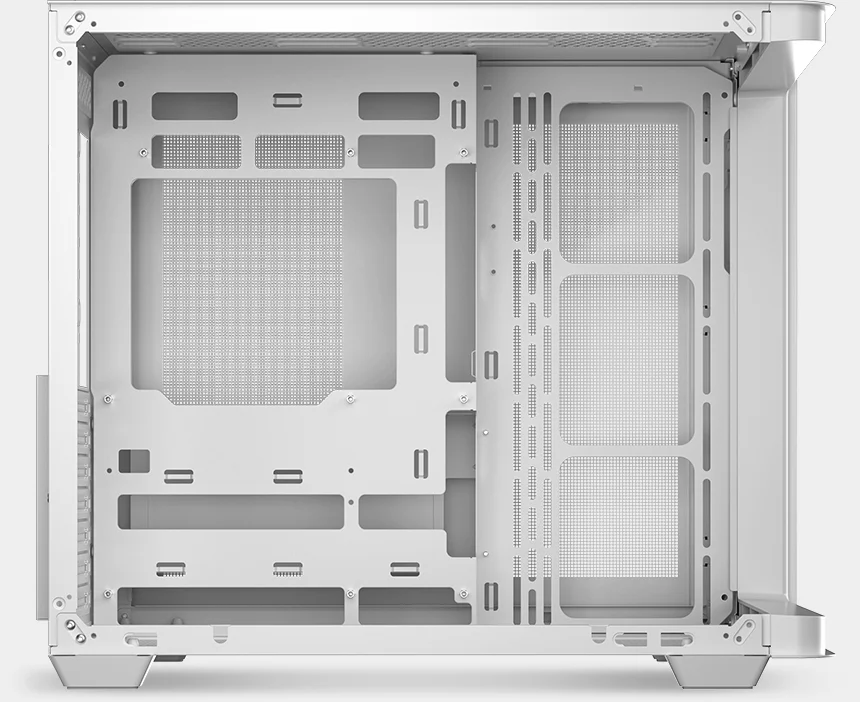 Компоновка с двумя камерами изолирует блок питания и накопители от основного воздушного потока. Большие сетчатые панели улучшают вентиляцию, входные реверсивные вентиляторы на боковой панели забирают свежий воздух, а задний вентилятор выводит тепло, за счет чего в корпусе образуется горизонтальный воздушный поток.