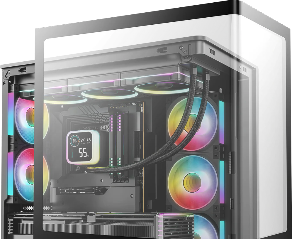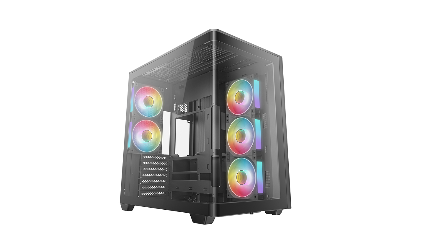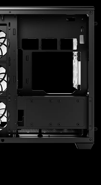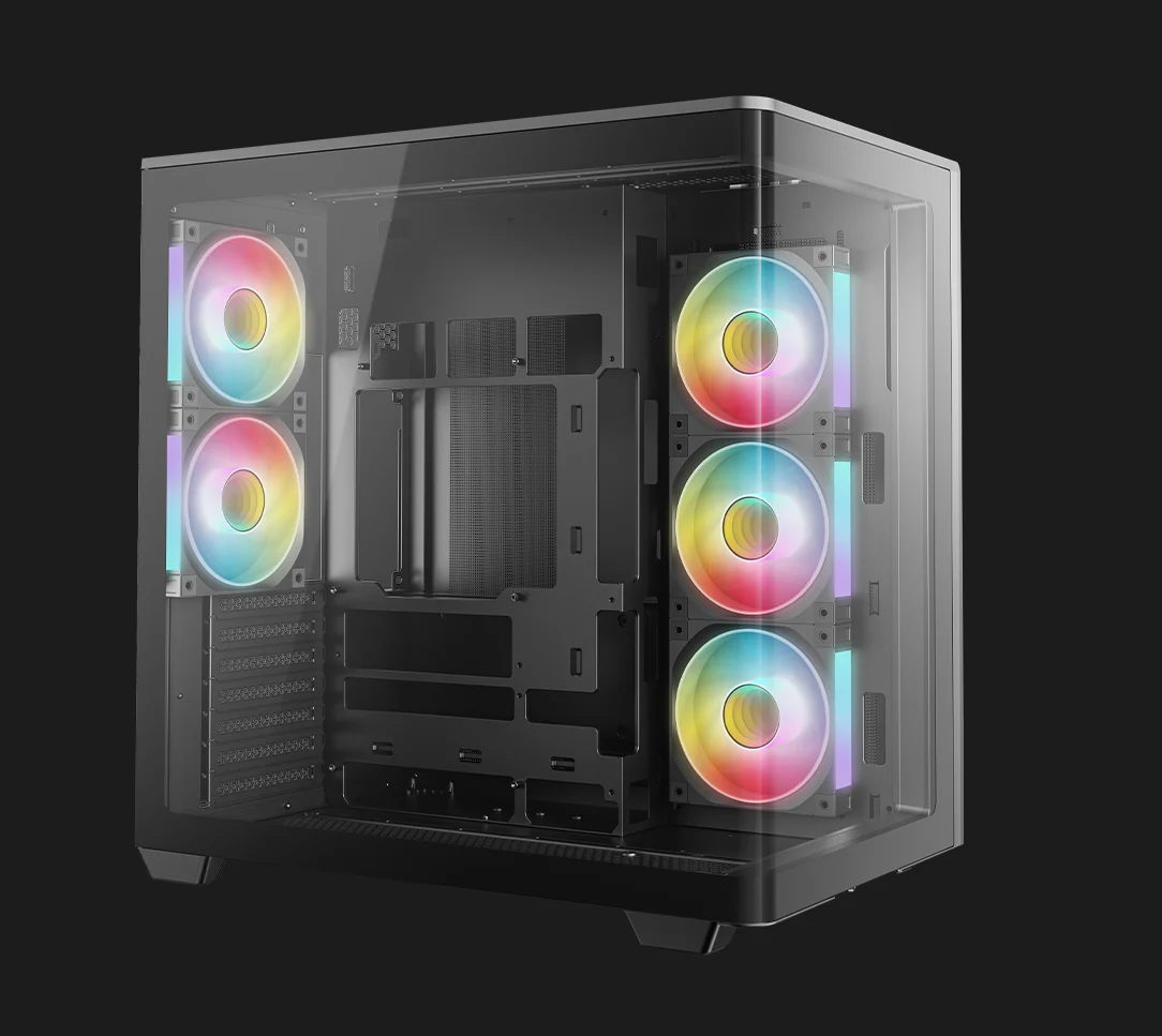 CG590U 5F — это просторный панорамный корпус с изогнутым стеклом и двухкамерной конструкцией. За счет пяти предустановленных вентиляторов ARGB он полностью готов обеспечивать мощный воздушный поток и яркую подсветку.