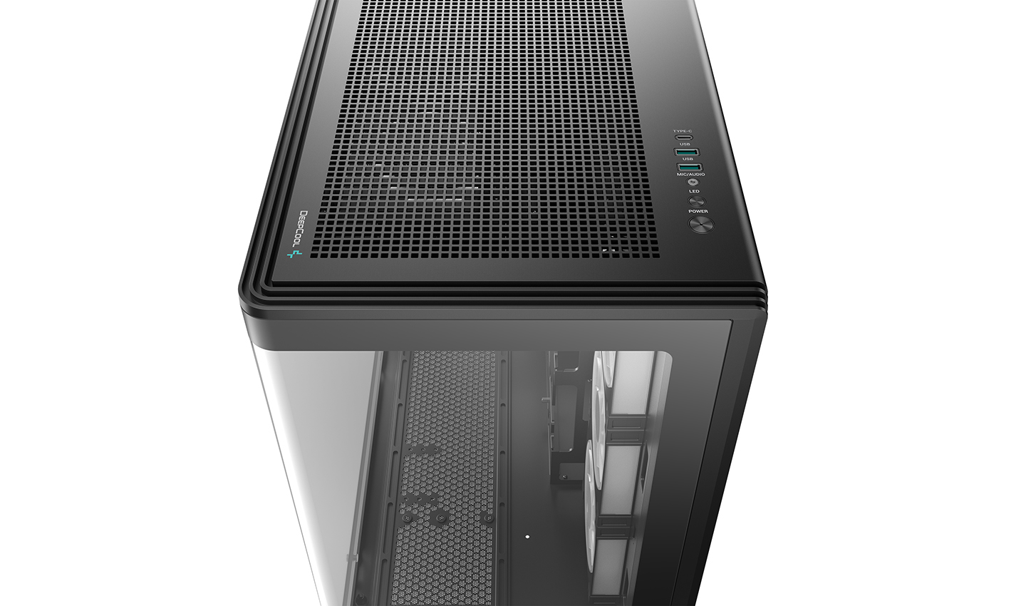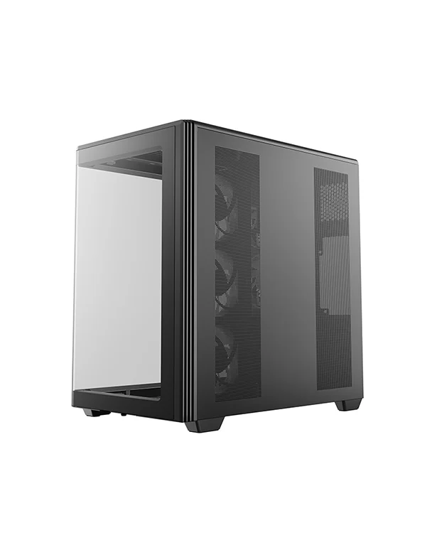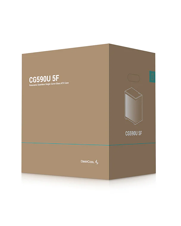 В модели CG590U 5F используется сплошная изогнутая панель из закаленного стекла, плавно огибающая угол корпуса. На этой панели нет видимых швов, за счет чего она открывает полный обзор на компоненты системы.