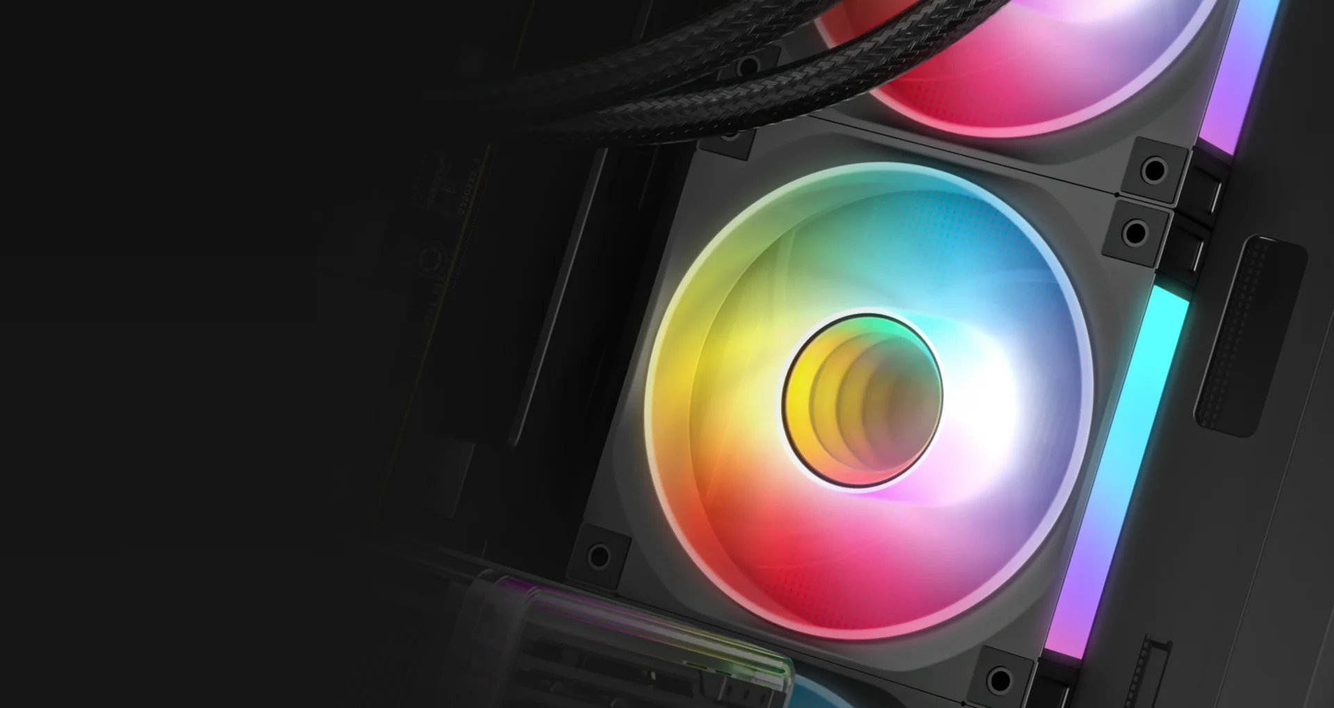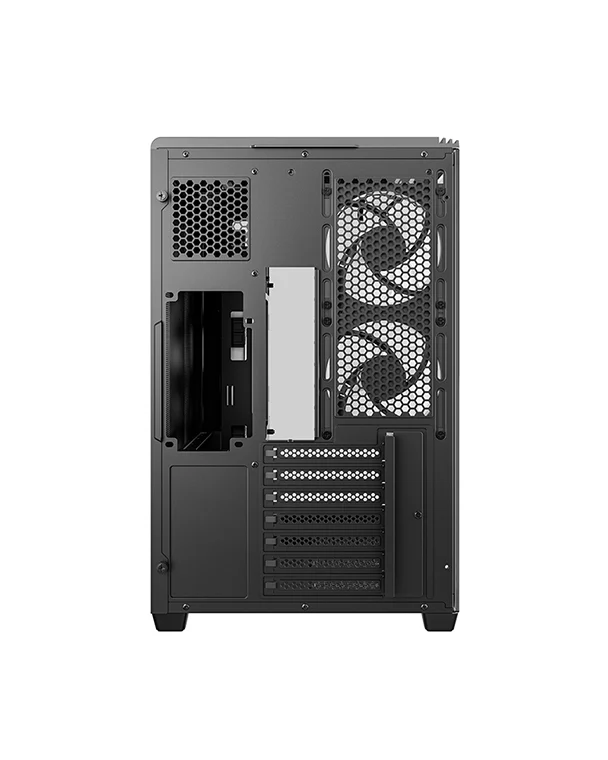 В CG590U 5F установлены два крепления для задних вентиляторов, позволяющие ускорить отвод воздуха из корпуса. Модель поставляется с тремя боковыми вентиляторами ARGB диаметром 120 мм с обратными лопастями и двумя стандартными задними вентиляторами, которые создают мощный горизонтальный поток воздуха.