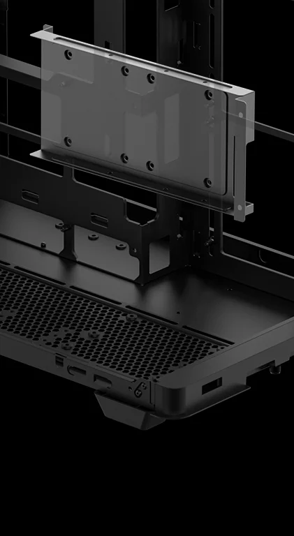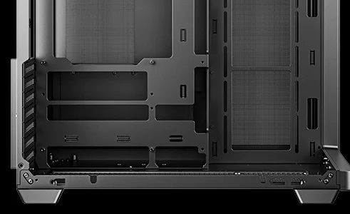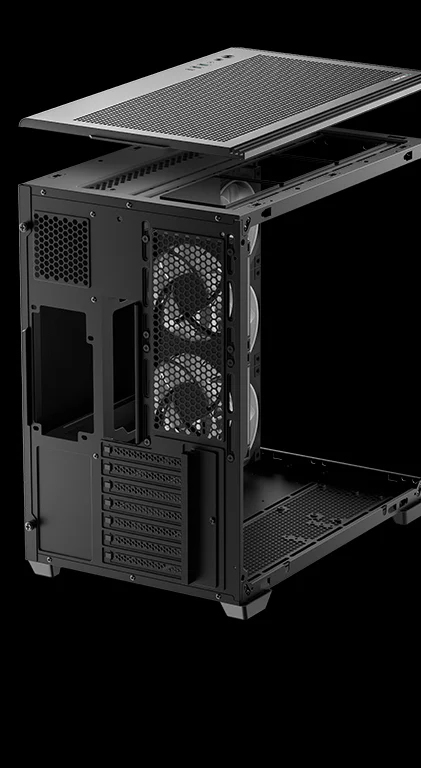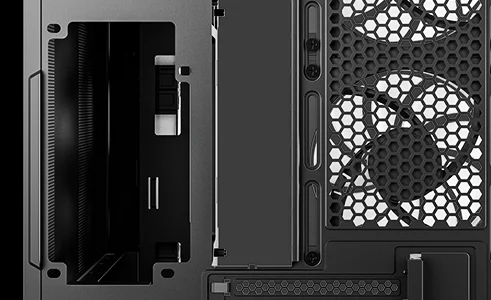 Двухкамерная конструкция позволяет вынести блок питания и накопители в отдельную зону охлаждения, чтобы воздух беспрепятственно поступал к видеокарте. Большие сетчатые панели сверху и сбоку улучшают вентиляцию внутри корпуса.