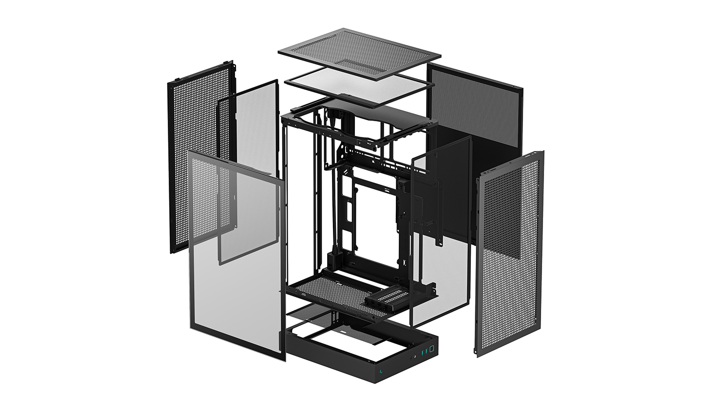 Благодаря сетчатым панелям со всех сторон и поддержке до шести вентиляторов диаметром 120 мм прохладный воздух наполняет компактную систему и отводит тепло. В максимальной комплектации можно установить 360-мм жидкостный кулер AIO сбоку или 174-мм радиатор на процессоре.